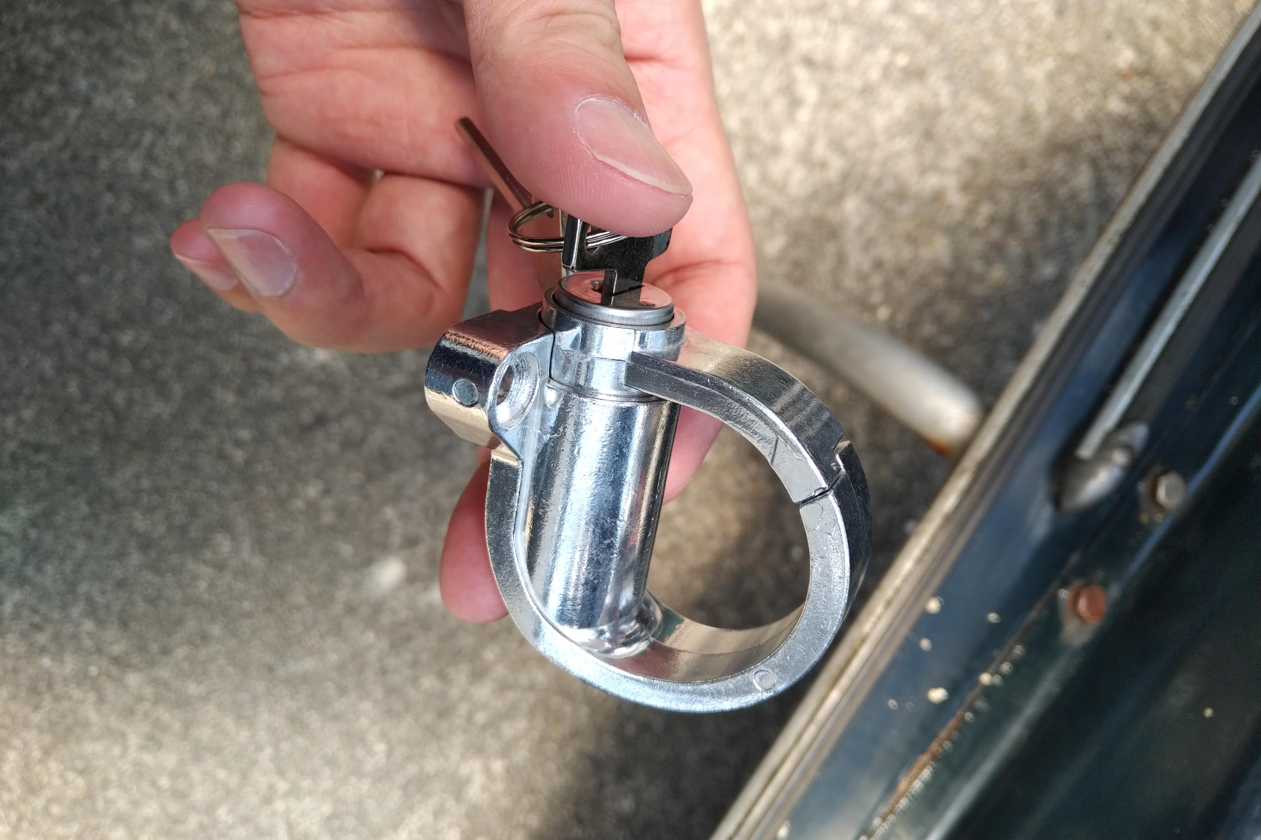 ハンドルの少し下にある鍵穴に鍵を入れ,鍵を押し込みながらハンドルを左に倒していくと,あるところで鍵がスポッと奥に押し込めるところがあります.この状態で鍵を少し回してから鍵を引き抜くと,押し込んだ部分がそのまま残って鍵だけが抜けます.こうすることで,ハンドルを左に切った状態でハンドルがロックされるわけです.