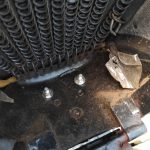 元々シートのフレーム先端には,こうしたフックを取り付けるためなのか,穴が2か所開いています.その上からシートの外皮がかぶさっているため,外から見ると穴は隠れていますが,確かにフレームには穴が開いています.